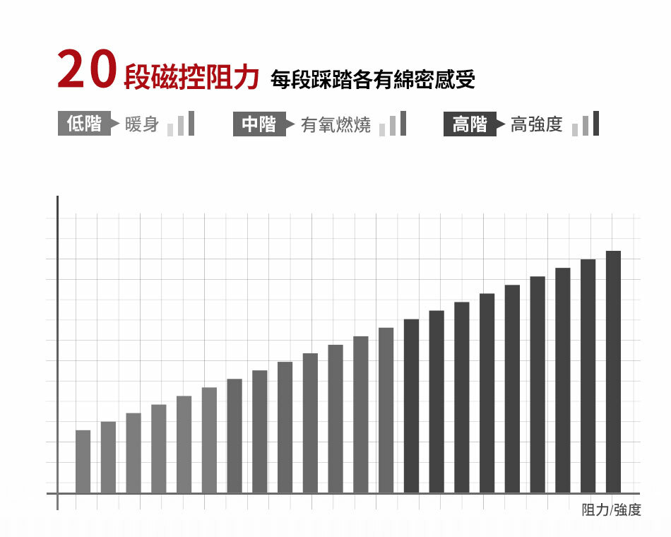 ● 20段磁控阻力變化,達到最佳的訓練效果